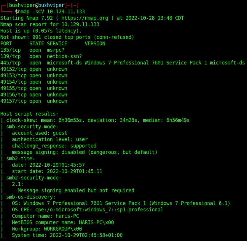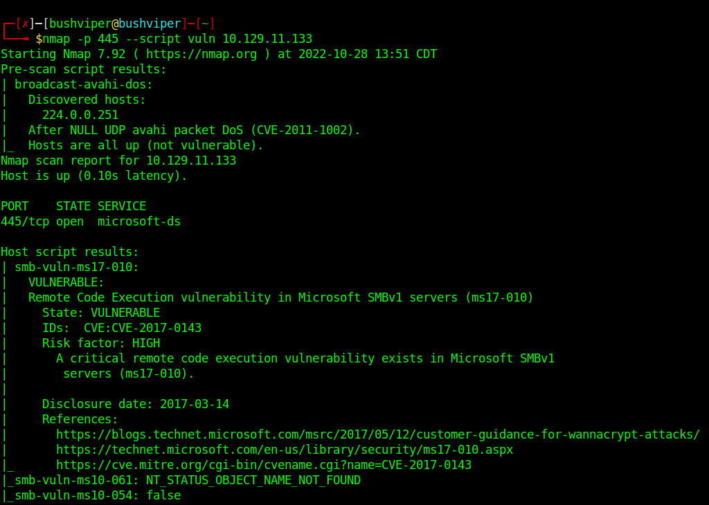 I run a vuln scan with nmap on the port and see if it is vulnerable with the command ‘ nmap -p 445 –script vuln <ip> ‘. As it turns out it seems to be vulnerable to ms17-010, which is one of my favorite exploits due to its history.