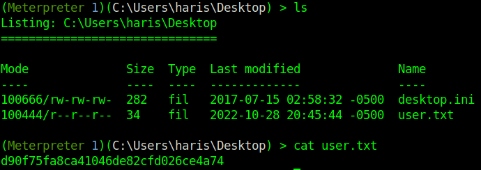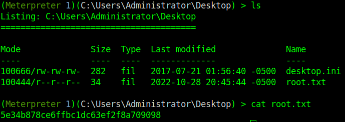 The exploit is successful! We are dropped into the system32 folder, so the first thing we gotta do is change directories to the admin’s desktop to get the root flag. After a few cd commands onto the admin’s desktop we get the first flag.