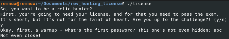 Hunting License is a very easy reversing challenge on Hack The Box. The description is “STOP! Adventurer, have you got an up to date relic hunting license? If you don’t, you’ll need to take the exam again before you’ll be allowed passage into the spacelanes!”