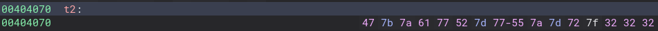 Once again it gets slightly more complicated. This time instead of reversing a string, it is XORing it instead. Going to &t2 we can see the string that is XORd.