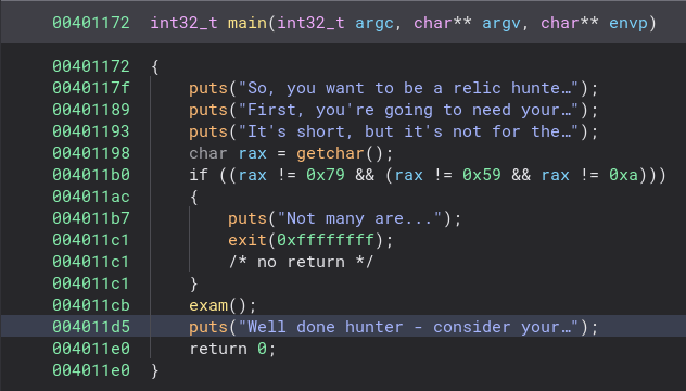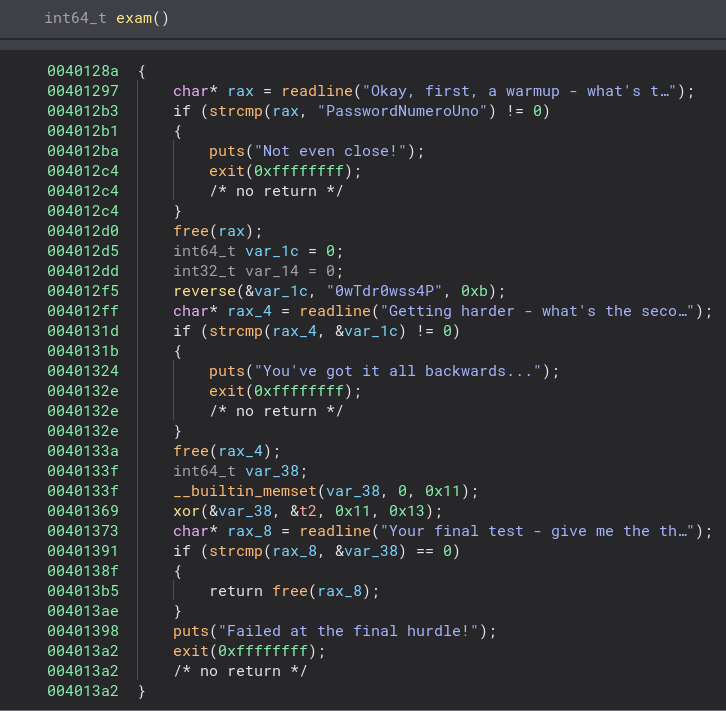 Looking at the main function we can see where it prints the text and where it checks if you are ready for the test or not. Then it runs a function named exam. That seems like the next logical place so let’s go check that function out.