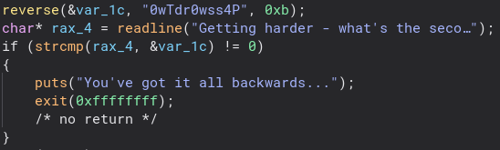 This one is slightly more complicated. A function named reverse is called on a string and then that is compared with our input. Without checking that function we can assume the name is what it does to the string and give “P4ssw0rdTw0” a try.