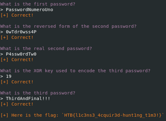 The last few questions are about the passwords and how we got them. And like that we are done! That is a fun and simple challenge to get started in reverse engineering. It also gives you a glimpse into some common obfuscation methods such as xor which are used in quite a few challenges. Thanks for reading and happy reversing!