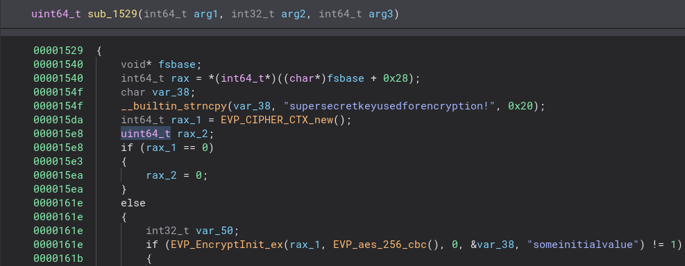 When opening the executable in Binary Ninja we are greeted with the main function. The first thing that sticks out to me is the OPENSSL crypto initialization and the “Sending File” string. Based off of this information and the name of the challenge it looks like this program encrypts files and then sends them. When using the program to send a file it calls the “sub_1835” function. This seems like a good place to start, so let’s get to it.