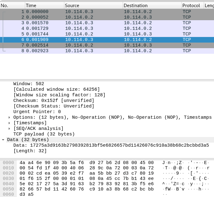 Checking through the packets sent we find one with some data in it. Let’s see if we can decrypt it using the info from the encrypt function.