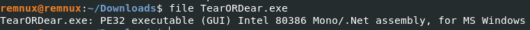 As always we are going to run the file command on the binary. Even though we know it is a Windows executable, we may learn other information that will help us reverse this binary.
