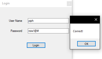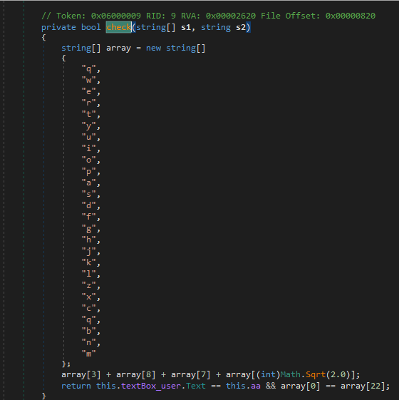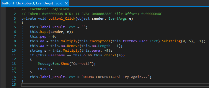 After looking through the functions the first one that pops out to me is the button1_Click function. This function is where the username and password checks are made. The first step is to figure out what “this.o” is. To do this we are going to set a breakpoint at the username and password comparison.