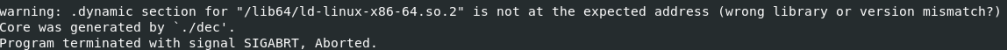 Trying to debug the core file with the command gdb ./dec core gives us this lovely error.