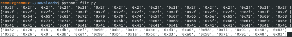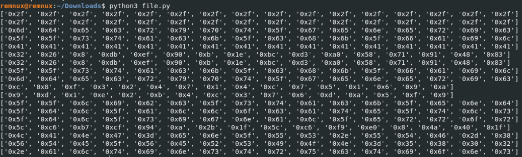 It iterates over every character in the core dump and when it gets to a zero, it checks if 17 characters after that is also a zero. If they both are zeros, that means we may have a 16 character string. Next, we put them in a list as hex characters. If there is not a zero in the list, then we print it out. It may not be beautiful, but it works. This is the output of that script