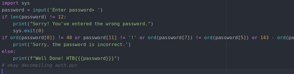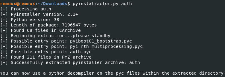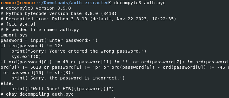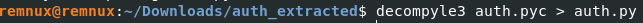 Next, we move into the new directory and “decompyle” the program using decompyle3.