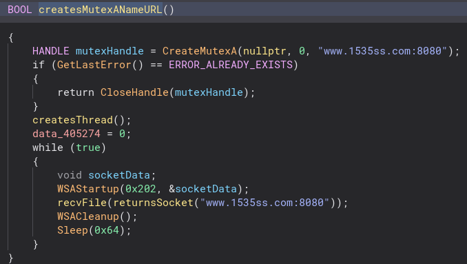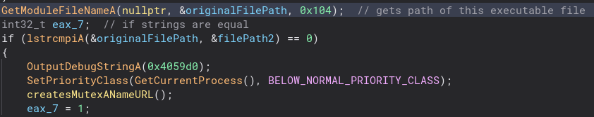 Getting out of all of this directory stuff we can now move on to more interesting code. Just under that we check if the file path from the System directories function is the same as the file path from GetModuleFileNameA. If they are, we create a Mutex that is named after the URL we found earlier. Let’s take a closer look at that.