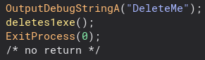 Below this, we delete the original 1.exe program. Thankfully the original developer left in debug strings so I could figure out what this code did 🙂