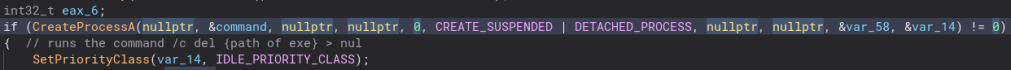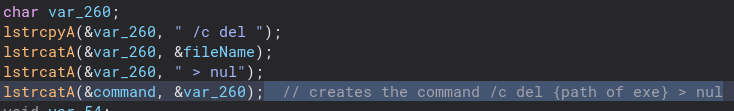 There is a bit of obfuscation in this function, but nothing too hard to understand. The program concatenates a string into the command to delete the 1.exe file.