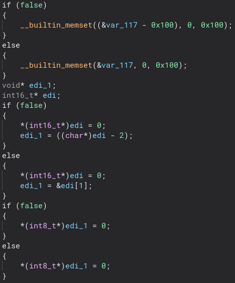 Let’s take a look inside of that. There is a lot that happens inside of this function, but we will start at the beginning. The first thing that sticks out to me, and would become a common theme for this malware are all of these seemingly useless if statements and memsets.