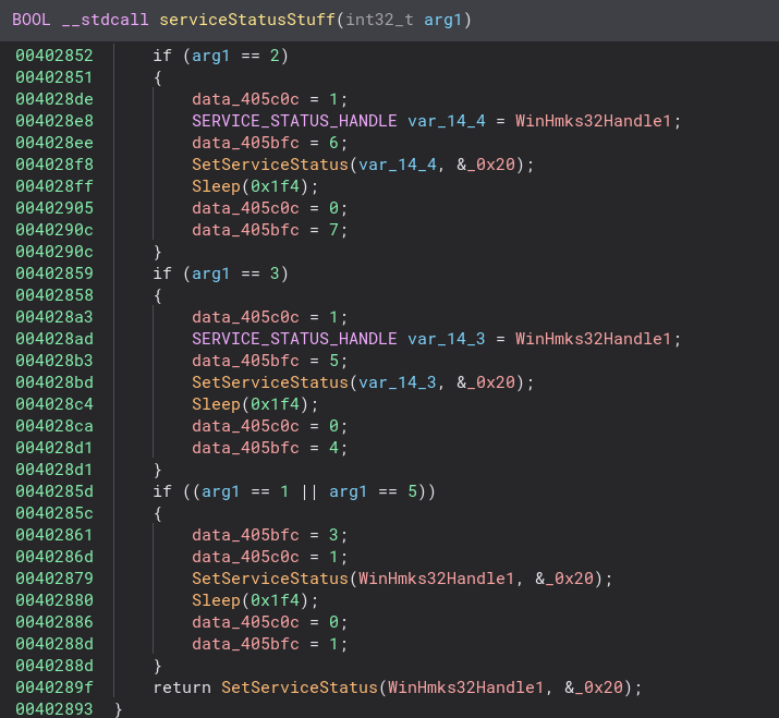 A lot of service related stuff happens in this function. A service status handle is created and copied. Going into the serviceStatusStuff function this happens even more. The service status is set to 0x20, which means it shares a process with other services.