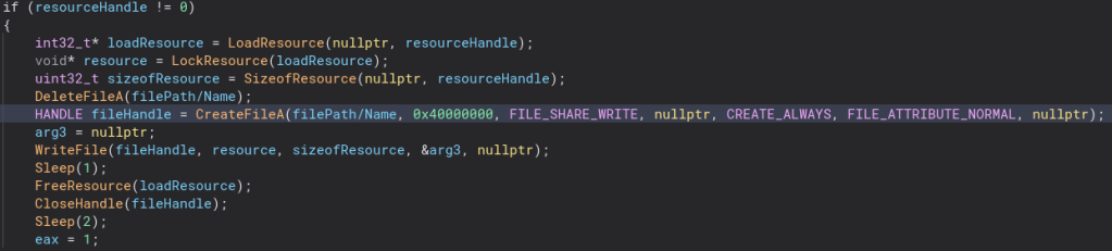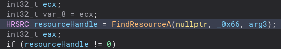 Next we are going to look at the dropDLL function. I assume this resourceHandle is where the program gets the code for the DLL file, but I could not figure out exactly how it worked.