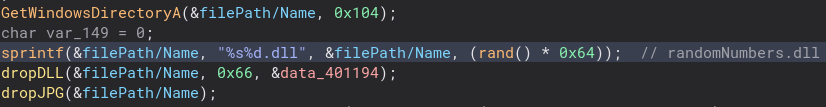 Scrolling down further in this function, we get to some file related stuff as well as the functions that drop a malicious DLL as well as a malicious executable pretending to be a JPG. The DLL file is given a random number name.