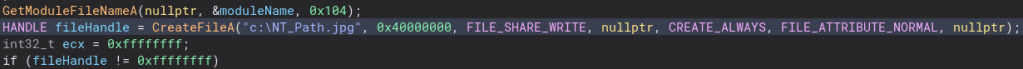 Going into the dropJPG function, it is much the same, except instead of a DLL with a name of random numbers, this file is named “NT_PATH.jpg”, but the contents of this file are the exact same. This may be to trick people who have file extensions turned off since they made expect to to actually be a picture and click on it, only instead of seeing a cute cat someone is watching them through their webcam.