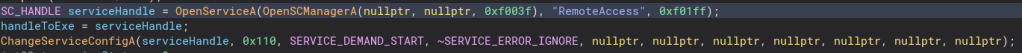 After we drop those files, we then start and configure a service. The service is named RemoteAccess. I am not 100% what this service does, but it may be used again in the second stage.