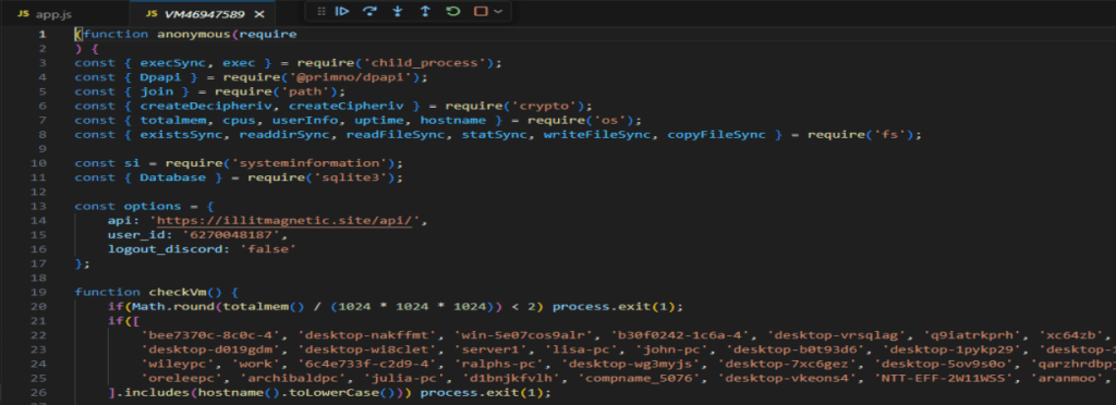 In the last post we ended with the obfuscated javascript program. I originally tried to run it with the node modules that came with it when I extracted it from the asar file, but it caused a lot of headaches so I decided to delete all the files besides the app.js file and install all the dependencies myself. You could do it statically, but if you can do that you probably do not need to read this post ;). I then opened it up in VSCode and ran it with debugging. I do not know much about javascript, but I assumed the program had to deobfuscate itself eventually, so I just paused and continued the program not really knowing what I was looking for. Luckily for me and this post, I eventually stumbled upon this.