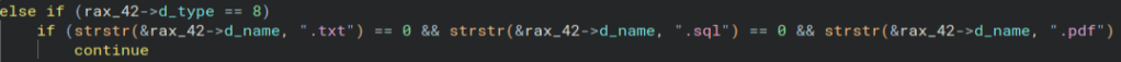 Looking into that function there are a few interesting things. The first I notice is a long string compare checking for file extensions. This is the list of file extensions that get encrypted by the ransomware. This screenshot is just a portion of them as it is way too long to fit all of it into one.