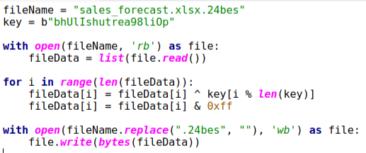 Now that we know how the files are encrypted and the key we can begin decrypting them. Here is a simple script that uses Python to open the files, XOR them with the key, and then write them back out while taking off the “.24bes” extension. All we gotta do is put the different file names into the script, and we have all of our original files back. Now we are able to answer all the questions.