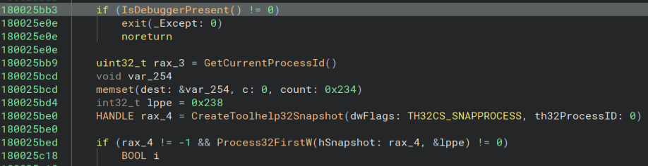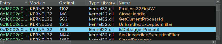 Next, we need to find the Windows API function for the final technique. Looking at the other spot that IsDebuggerPresent is called, we find this