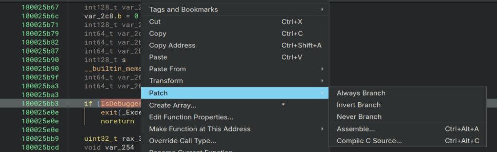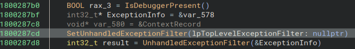 SetUnhandledExceptionFilter can also be used to stop debuggers. Here is another good article about it from the same website. https://anti-debug.checkpoint.com/techniques/exceptions.html While I am in here I go ahead and patch out the anti-debugger checks so I do not have to worry about them later. Here I use the Never Branch option to patch out this check.
